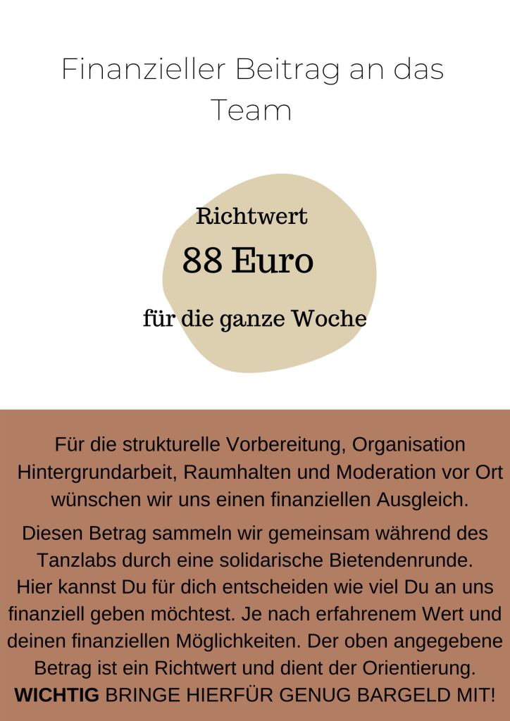 Wir möchten die Finanzierung für das Tanzlab möglichst transperent gestalten, deshalb sind die Kosten in 3 Kategorien aufgeteilt.