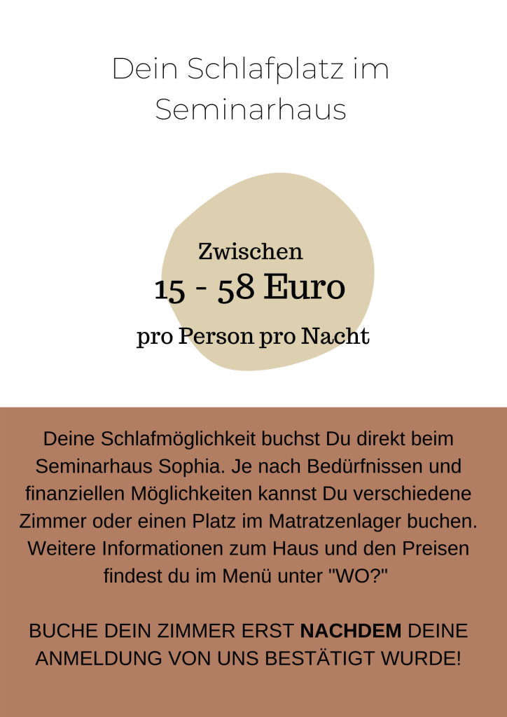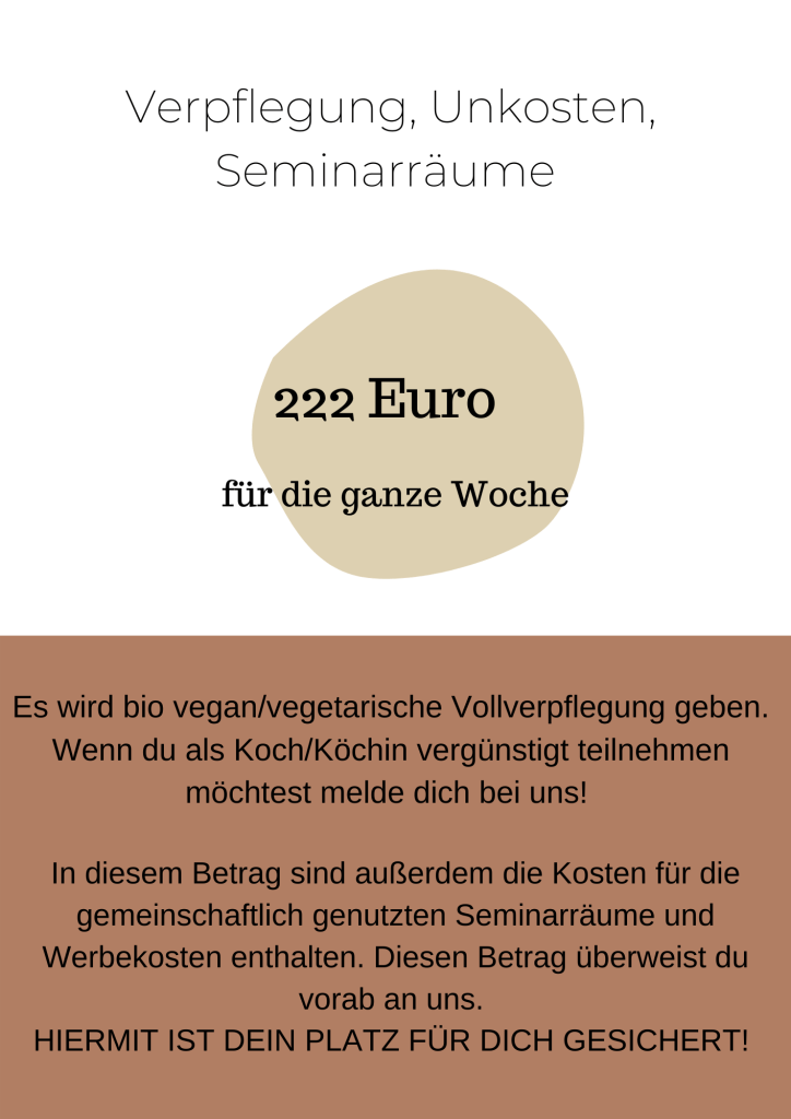 Wenn dieser Betrag für dich eine Hürde darstellt und du trotzdem dabei sein möchtest melde dich bei uns und wir schauen gemeinsam, welche Möglichkeiten es gibt, dass du teilnehmen kannst!